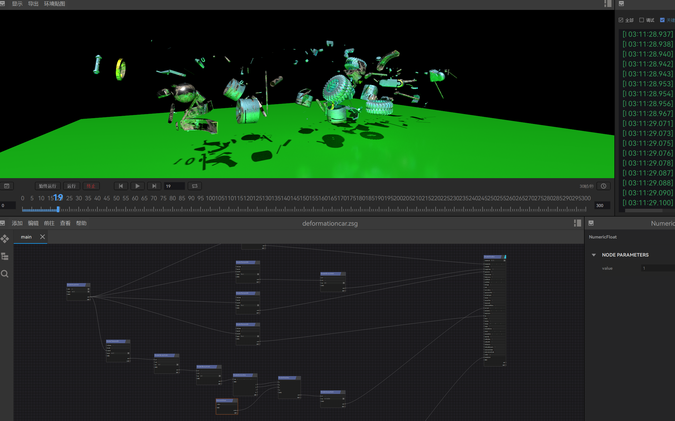 >s 利用ZENO的循环操作,我们可以制作一些程序化的变形动画效果,极大的节省了传统的动画K帧时间,也可以制作出更多复杂可控的效果。  源文件下载:[【附件】deformationcar.zip](/media/attachment/2022/06/deformationcar.zip) ## 基本模型导入 1.通过==ReadAlembic==节点导入源文件里的`motuo.abc`模型文件,创建==GetAlembicPrim==可以精确获取abc文件的每一部分。默认读取的index为0.  2.添加==BeginFor==+===EndForEach==节点,循环次数为156,`Index`连接给==GetAlembicPrim==的`Index`,运行后我们看到整个模型完全加载出来。  ## 动态偏移 1.创建==NumericInterpolation==节点,需要映射的数值`src`连接循环的`index`,输入最小最大值为0,156.输出最小最大值为-20,20.  2.在循环内部创建一个==TransformPrimitive==节点。通过==packNumericVec==节点控制`Translation`,将==NumericInterpolation==映射后的数值给到==packNumericVec==的`Z`端口,运行后我们发现每个零件的沿着Z轴的-20-20距离内排列。  3.将时间轴范围调整到0-300,再次创建==NumericInterpolation==节点,对==GetFrameNum==时间帧进行映射。输入最小最大值为0,200.输出最小最大值1,0.勾选`isClamped`将结果输入到一个==NumericOperator==节点上,`op_type`选择`mul`,与==packNumericVec==相乘,结果给到==TransformPrimitive==的`Translation`上。播放动画,我们就可以看到物体从0帧到200向原始位置合并。   ## 动态旋转 1.首先调整下节点的位置,将==packNumericVec==节点放到==NumericOperator==节点的后面。再次创建一个==packNumericVec==,`X`端口连接==NumericOperator==,结果输出到==TransformPrimitive==的`eulerXYZ`端口,点击运行。我们可以看到它的旋转也随时间发生了变换。   ## 前进动画 1.再循环结果后面创建一个==TransformPrimitive==,通过==packNumericVec==的`X`值控制物体的X轴的平移。该值是通过==NumericInterpolation==节点对==GetFrameNum==的映射,输入最小最大值为200-300(因为循环内的动画200帧结束),输出最大最小值为0-8(代表循环结束后到300帧向X轴正方向移动8个单位)。 运行后我们就看到循环后车子就有了前移的动态。   ## 创建地面 1.创建==CreatePlane==节点,`size`设置为65,我们得到一个面片,运行后我们发现他和主体模型有穿插。  2.通过过==packNumericVec==的`Y`值控制物体的Y轴的运动,该值是通过==NumericInterpolation==节点对==GetFrameNum==的映射,输入最小最大值为200-205(让面片在循环结束后的五帧内移动到原点),输出最大最小值为-0.1-0.此时我们就可以看到在循环结束后地面就有了向上移动的动画效果。   ## 材质制作 1.首先创建两个==ShaderFInalize==节点,设置不同的`basecolor`值。分别命名`mtlid`,打开显示按钮。   2.通过==BindMaterial==节点分别将地面和车子绑定给我们创建好的材质。`mtlid`输入正确的材质名字。点击视窗`显示`菜单的`光线追踪`命令,我们就得到了初始的材质渲染效果。  3.创建5个==MakeReadPath==节点。分别读取源文件里的Albedo、Gloss、Specular、Normatl、Ao贴图。连接到==MakeSmallList==上。  4.创建一个==BeginForEach==+==EndForEach==循环,里面通过==MakeTexture==获取到每一个贴图的路径转换为ZENO可读取的tex。将循环结果输出给==ShaderFinalize==的`tex2dlist`端口。  5.创建==ShaderInputAttr==`attr`选择uv.连接给`ShaderTexture2d`节点,`isCUda`选择1,`texid`为0.最后结果输入给==ShaderFInalize==的`basecolor`端口。`metallic`设置为1.点击运行,就看到车子有了颜色贴图并且产生了金属质感。  6.同样的,将其他贴图也连接上去,注意贴图的id和数据类型,gloss贴图需要被1减去连接给`roughness`。  7.法线贴图的连接方式。  8.最后点击运行,我们就可以看到赋予了材质后的动画效果。