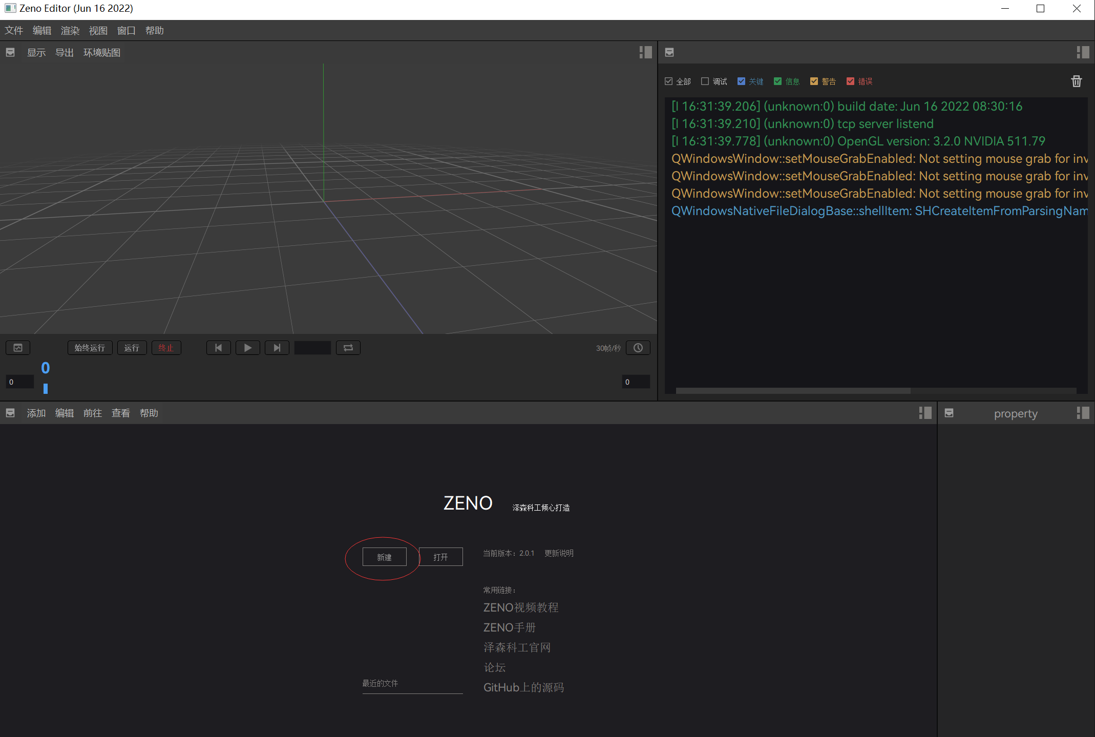 ## 开始页面 打开ZENO之后,我们可以通过开始页面新建场景或者打开之前的工程。并且也可以通过该页面获取相关的教程文档及视频链接。如果是第一次打开,可以直接点击`新建`按钮。  ## 初始布局 ZENO软件的初始布局可以分为以下5个区域: >d ①视图查看区域 ②节点操作区域 ③大纲列表区域 ④运行日志区域 ⑤节点参数区域  ## 视图区域 按住`鼠标中键`移动可以旋转视图,按住`Shift+鼠标中键`可以移动视图,前后`滚动鼠标滚轮`可以放大缩小视图。  ## 节点面板 将鼠标放到节点面板区域,按键盘上的`Tab`键或者鼠标右键可以调出节点菜单,选择或者输入需要创建的节点名称,左键点击即可在节点面板上出现该节点,以`CreateCube`为例,点击节点右上方的显示按钮,并且开启时间轴上方的`始终运行`或者`运行`按钮,即可在视图里得到一个立方体盒子。  ## 大纲列表 在大纲列表区域,我们可以查看、设置或者搜索场景中的所有子图(封装的节点工具)和节点,也可以点击相应的图标折叠或者展开大纲。  ## 运行日志 搭建好节点运行结果的时候,我们可以在运行日志区域通过查询相关的信息来确定是否正常运行,也可以通过相应的提示修改工作流程。  ## 节点参数 选择节点,参数面板上会出现该节点的参数调整区域,我们可以修改相应的参数,从而得到我们想要的效果。