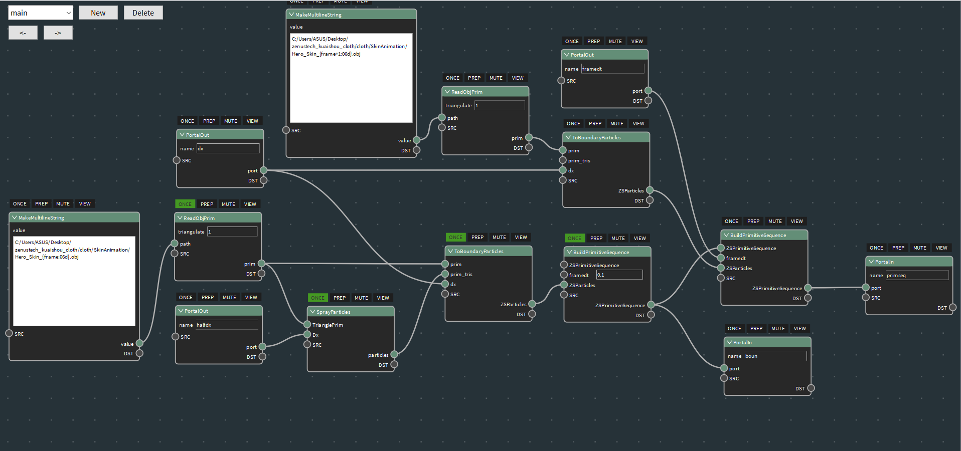 在ZENO中,我们可以为布料设置动态碰撞体。 案例源文件:[【附件】案例.zip](/media/attachment/2022/08/%E6%A1%88%E4%BE%8B_AvNBgzx.zip) 案例所需模型文件: ## 准备基本变量   流程[布料基本解算流程](http://doc.zenustech.com/project-3/doc-174/ "布料基本结算流程")的大致相同。 #### 细节讲解 不同之处: 1.将dx除以2之后定义为halfdx变量。 2.定义framedt变量,初始值为0.1 3.由于动态碰撞体使用PrimitiveSequence而不是Boundary,所以需要值替代。 本案例将`transfer`属性为boundary的ZSGrid定义为boundary全局变量,以替代==movingmpmstep==节点的boundary端口。如下图  ## 制作布料  #### 细节讲解 1.读取案例模型文件中的Dress.obj 如下图  2.配置本构模型并转化为ZSParitcles 3.将其定义为dr全局变量 ## 导入角色  动态边界需要用到动画obj序列文件, 每一帧都会读入当前帧和下一帧对应的obj文件信息并组成队列 #### 细节讲解 1.用==ReadObjPrim==节点读取 案例模型文件存储目录/Hero_Skin_{frame:06d}.obj 以读取**当前帧**对应的obj文件,如下图  2.将其连入==SprayParticles==节点,再将`particles`输出端口连入==ToBoundaryParticles==节点转化为BoundaryParticle物体,再用==BuildPrimitiveSequence==节点构建队列,并定义为boun全局变量 3.用==ReadObjPrim==节点读取 案例模型文件存储目录/Hero_Skin_{frame+1:06d}.obj 以读取**下一帧**对应的obj文件,如下图  4.用与第2步相同的方式构建队列,但是要将**当前帧**的队列连接到**下一帧**队列的`ZSPrimitiveSequence`端口,将两个队列合并(如上图),并定义为primseq变量,结果如下  ## 防止布料滑落  #### 细节讲解 1.创建一个较大的穿过角色腰部和布料外围的圆柱体,如下图  2.将其转换为ZSParticles物体,以便于卡住布料防止其滑落 ## 更新粒子数据  #### 细节讲解 如果不更新粒子数据,ToZSParticles输出的物体就不会下落, 在本案例中,由于不需要使固定布料的圆柱下落,所以不需要更新粒子数据,只需要将所有布料组合成list即可 ## 配置解算器  #### 细节讲解 流程与[布料基本解算流程](http://doc.zenustech.com/project-3/doc-174/ "布料基本结算流程")的基本相同。 ## 显示最终结果  #### 细节讲解 流程与[布料基本解算流程](http://doc.zenustech.com/project-3/doc-174/ "布料基本结算流程")的基本相同。 用于固定布料的圆柱体无需显示,此处只显示布料和角色即可
