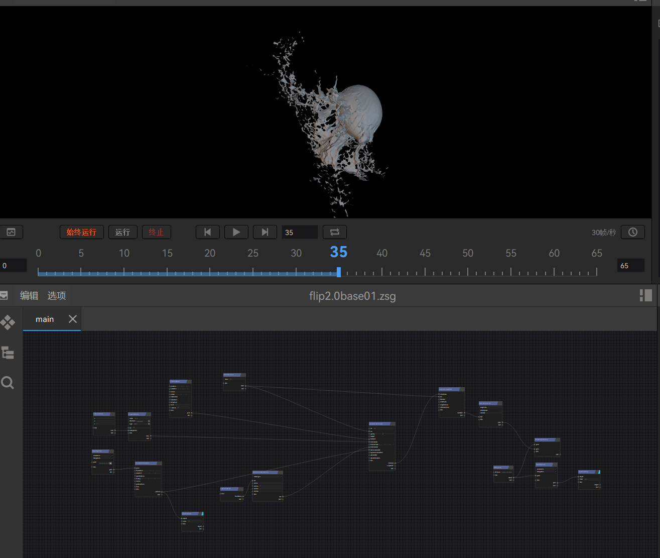 > s 相对于1.0,ZENO2.0在流体解算使用的节点量更加少,并且还可以通过光追渲染。我们通过一个水拍柠檬的案例,来熟悉ZENO2.0的流体解算步骤。 案例源文件: [【附件】lemon.zip](/media/attachment/2022/07/lemon.zip)   解算的节点数量:  ## 流体解算器 ==GenericFlipSolver==节点是ZENO2.0中的默认流体解算器。可以直接在上面设置一些基本参数,其中,`dt`我们保持默认。创建一个0.025的`NumericFloat`作为测试解算的`dx`值。  ## 流体发射源 1.通过==CreateSphere==节点创建一个基本的小球,其中`position`为:0,1,-2.`scaleSize`为0.2,0.2,0.2.最后将小球连给==GenericFlipSolver==节点的`EmitSDF`端口。(该端口可以使用prim模型,在内部直接转换为SDF。也可以连接一个SDF模型。)  2.将==GenericFlipSolver==节点的`EmitEnabled`开关选择勾选开启。点击`运行`我们就可以看到流体已经在发射了,是持续发射,这个案例我们需要让它只发射一帧。  3.在==GenericFlipSolver==节点的`EmitEnabled`端口中,如果输入是0则发射源不会发射流体,如果输入的是1发射源就会发射流体。那么我们只需要将这个输入的数值做一个动画,就可以控制流体发射的时间帧数。我们需要创建一个==GetFrameNum==节点获取帧变量,连接给==NumericInterpolation==节点`src`端口。勾选`isClamped`。`srcMin、srcMax`输入0,1.`dstMin、dstMax`输入1,0.将结果输入给==GenericFlipSolver==节点的`EmitEnabled`端口。点击运行,此时流体就只在第0帧发射了。   ## 碰撞体 1.通过==ReadObjPrim==节点导入源文件中的ningmeng.obj模型。然后再通过==PrimScale==将模型放大5倍。最后连接给==GenericFlipSolver==节点的`StaticCollideSDF`端口。点击运行,我们发现,流体是碰撞不到柠檬模型的。  2.创建==MakeVDBGrid==节点,`type`设置为float3.并且创建一个数值为0,0,5的==NumericVec3==节点连接给==MakeVDBGrid==的`background`输入端。代表发射速度方向是Z轴,大小是5.最后将==MakeVDBGrid==节点连接给==GenericFlipSolver==节点的`EmitVelGrid`端口。此时运行后流体就和柠檬模型碰撞了。   ## 包面 ZENO2.0中可以通过==SmoothLiqudSDF==节点对解算出来的粒子进行包面处理。`Dx`需要和流体解算的`Dx`一致,其他参数可以按默认值处理。   ## 写出 首先通过==SDFToPrimitive==节点将包面转换为Prim模型,再创建==WriteObjPrimitive==节点对最终的模型写出。其中path路径需要创建一个==StringEVal==节点设置。输出序列需要在路径上写$F变量。例如: > s E:/ZENO/pro/flip/cache/ningmeng/nm.$F.obj 设置好之后可以将全局`Dx`参数设置低一些,点击运行进行最终写出。  ## 材质 1.通过==ReadObjPrim==节点读取缓存,`path`端口可以直接连接==StringEavl==,连接==BindMaterial==节点绑定`Mat1`材质。(Mat1在下一步创建)  2.创建==ShaderFinalize==节点,打开运行按钮。将`metallic`设置为1,`opacity`设置为0.9.  3.在柠檬模型的后面创建==BindMaterial==节点,在`mtlid`内输入mat2,再创建一个==ShaderFinalize==节点,在`mtlid`内也输入mat2。这样柠檬模型的材质就和mat2绑定了。  4.创建==MakeTexture2D==节点,`path`内指定源文件提供的柠檬贴图,通过==MakeList==节点连接给柠檬材质==ShaderFinalize==节点的`tex2dList`端口。  5.通过以下方式将贴图赋予到材质的`basecolor`上,其中==ShaderBinaryMath==节点让原始贴图更加色彩更加偏向绿色。  ## 渲染 在视图中显示菜单下选择`光线追踪`,便可以切换到渲染窗口,查看实时渲染效果。