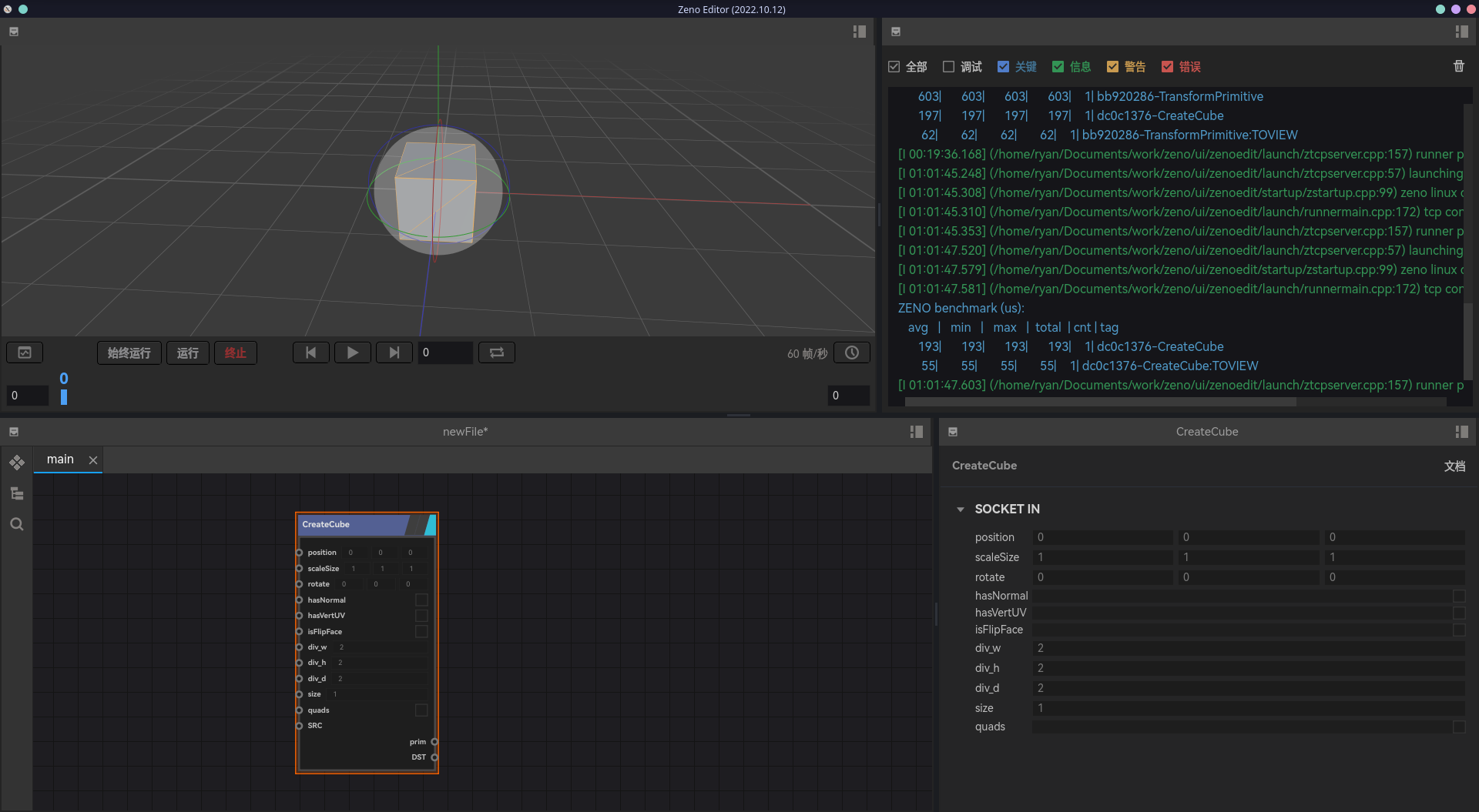 # 视图系统 ## 基本变换 这里以一个cube为例。首先创建一个cube,然后选中它。  按t键可以唤出平移的handler。  按r键可以唤出旋转的handler。  按e键可以唤出缩放的handler。  双击transform primitive节点的**黑色部分**,也可以唤出handler。  不过需要注意的是,必须要保证双击的节点一定run过。如果是自动创建的transform primitive节点,必须要点击run之后再双击才有效。如果希望切换handler的类型,只需要连续双击即可。不过这么做起来有些许繁琐,推荐的方式是通过双击transform primitive节点在viewport定位到物体之后,再通过快捷键的方式切换handler。 handler的使用和主流DCC软件类似。不过目前还尚未支持切换坐标系,所以所有的变换都是世界坐标系下的变换,这就导致缩放handler目前仍然不太可用。 ## 关于节点数据同步 在通过handler对primitive进行变换之后,如果primitive对应的节点没有连接transform primitive节点,系统会自动创建一个transform primitive节点,并且把变换的数据同步到这个节点中。并且系统会自动切换节点的可视性。 如果primitive本身就是由transform primitive节点变换得到的,那么就不会创建新的transform primitive节点,而是把数据同步到已有的节点上。  平移的数据会同步到节点的translation属性上,缩放的数据会同步到节点的scaling属性上,旋转的数据会同步到quatRotation属性上。 如果transform primitive属性上的值通过其他节点指定,那么对对应的primitive进行变换,仍然会创建新的transform primitive节点。  ## 视角变换 在保证鼠标焦点在viewport的情况下。 按数字键1可切换为主视图  按数字键3可切换为右视图  按数字键7可切换为俯视图  如果使用ctrl+1/3/7组合键就可以切换为相反视图。例如ctrl+1为后视图。