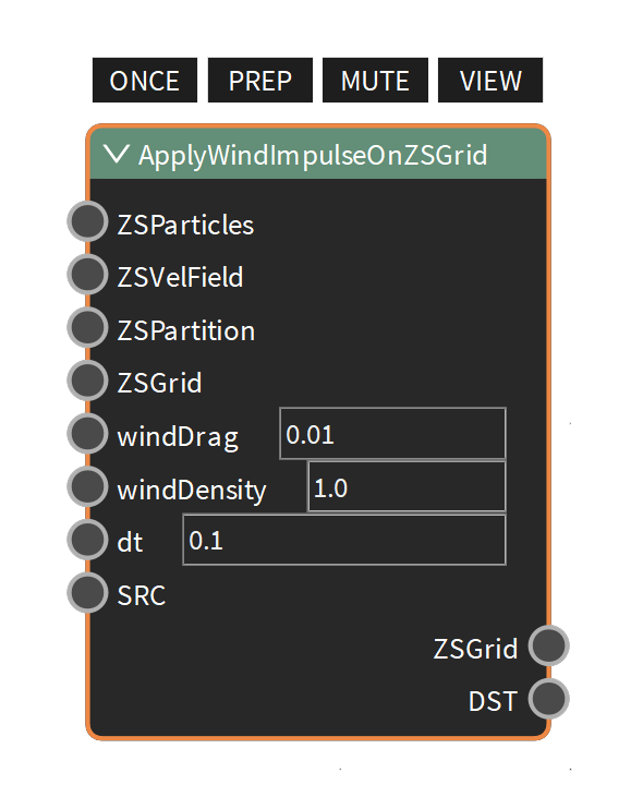## 节点作用 对布料进行风力计算 ## 节点样式  ## 端口用途 #### Input【节点输入端口】 | 端口名称 | 端口用途 | | --- | --- | | ZSParticles | 输入待计算的ZSParticle物体 | | ZSVelField | 风力方向以及大小(需要先转化成ZSLevelSet数据) | | ZSPartition | 输入ZSPartition数据 | | ZSGrid | 输入ZSGrid数据 | | windDrag | 风速相对于面片速度的切向分量的拉力 | | windDensity | 风速相对于面片速度的垂直分量的推力 | | dt | 子步长,值越小解算越精细 | | SRC | 影响解算先后顺序的端口,另一个节点A与该端口连接表示在执行本节点运算前先执行节点A | #### Output【节点输出端口】 | 端口名称 | 端口用途 | | --- | --- | | ZSGrid | 计算完风力后的ZSGrid数据 | | DST | 影响解算先后顺序的端口,另一个节点A与该端口相连表示在本节点运算后执行节点A |