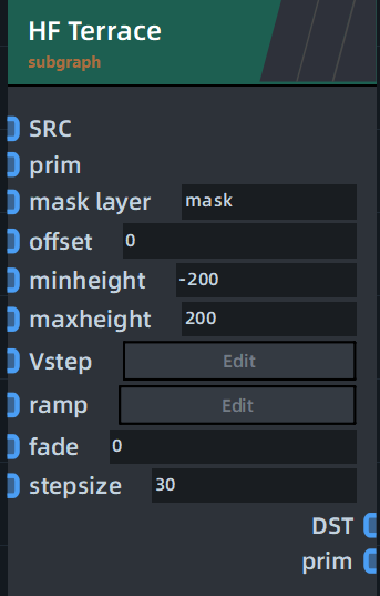 ## **节点作用** ·在指定高度上生成阶梯 ## **节点样式**  ## **端口用途** **Input【节点输入端口】** | 端口名称 | 端口用途 | | --- | --- | | SRC | 影响解算先后顺序的端口。另一个节点A与该端口连接表示在执行本节点运算前先执行节点A。 | | prim | 需要处理的地形 | | mask layer | mask层的名字 未完。。 | | offset | 每层的高度之间的偏移 | | minheight | 不修改比这个海拔低的区域 | | maxheight | 不修改比这个海拔高的区域| | Vstep | Ramp的X轴代表最小/最大高度,这个表示stepsize乘 垂直轴的百分比 这个可以使您创建stepsize不同的terrace| | ramp | rampX轴代表最大/最小高度的范围, 纵轴代表特定高度的淡化量(在全局淡化参数的基础上),这个可以允许梯田在特定高度被山体所覆盖 | | fade | 全局淡化:原始地形在梯田中的显示程度。0显示只有梯田,1显示没有梯田,介于两者之间的值将梯田与原始地形混合。 | | stepsize | 单个台阶的最大高度。数值越高,高台阶的数量就越少。较低的值会有更多的短层。 | **Output【节点输出端口】(2个)** | 端口名称 | 端口用途 | | --- | --- | | DST | 影响解算先后顺序的端口。另一个节点A与该端口相连表示在本节点运算后执行节点A。 | | prim| 输出计算后的Grid | ## **相关节点** 子图路径:misc/graph.. [Height Pattern](http://doc.zenustech.com/project-5/doc-329/)